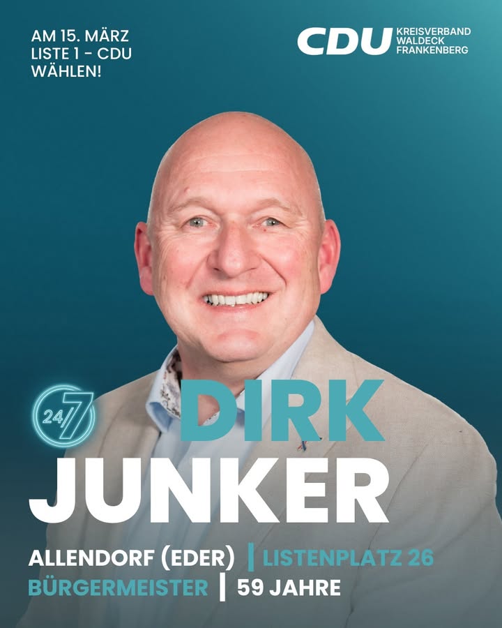 Ich bin Dirk Junker, 59 Jahre, aus Allendorf (Eder) und beruflich Bürgermeister. Ich kandidiere auf Listenplatz 26 für die CDU Waldeck-Frankenberg für den Kreistag. Ich freue mich auf einen engagierten Wahlkampf. Am 15. März: Liste 1 ? CDU wählen.
