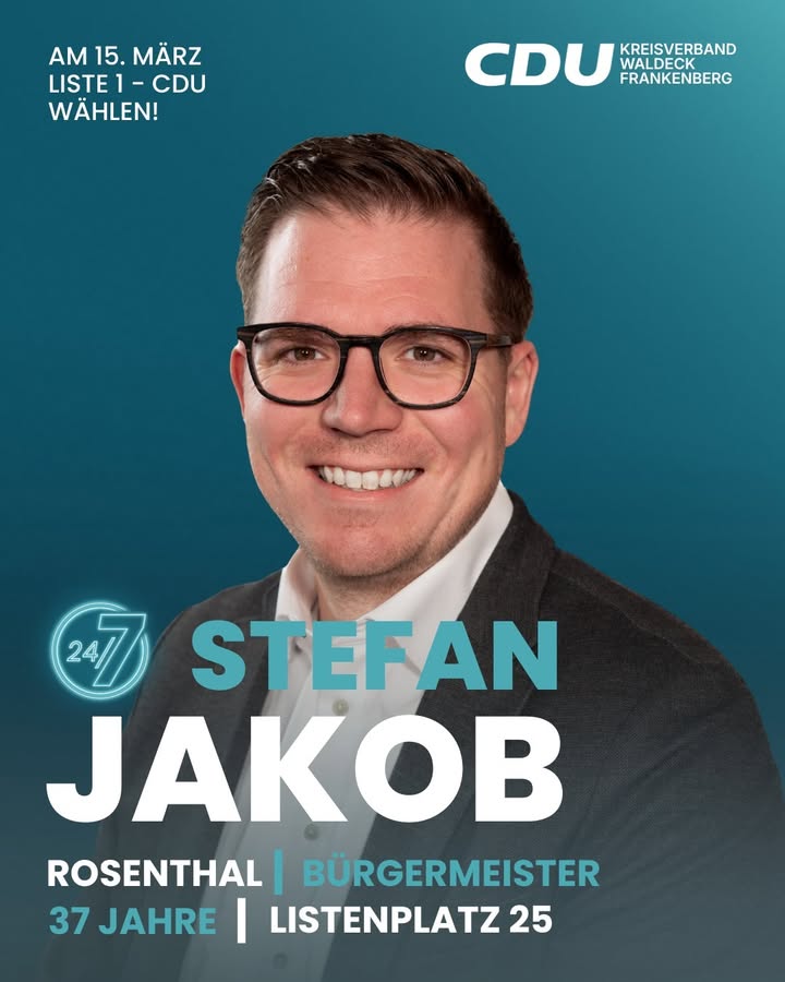 Ich bin Stefan Jakob, 37 Jahre, aus Rosenthal und beruflich Bürgermeister. Ich kandidiere auf Listenplatz 25 für die CDU Waldeck-Frankenberg für den Kreistag. Ich freue mich auf einen engagierten Wahlkampf. Am 15. März: Liste 1 ? CDU wählen.