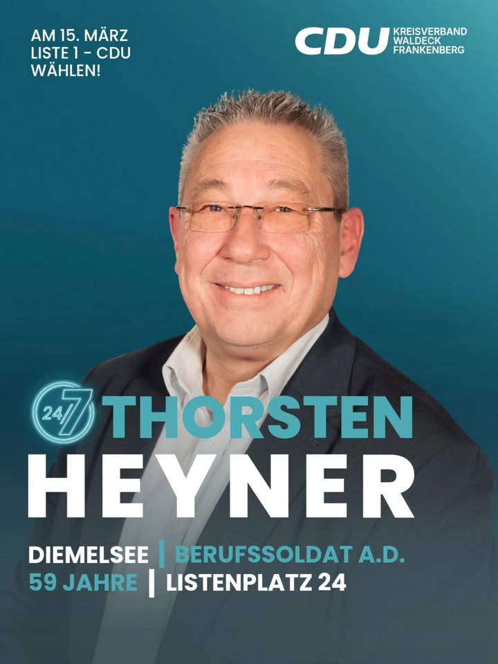 Ich bin Thorsten Heyner, 59 Jahre, aus Diemelsee und beruflich Berufssoldat a. D.Ich kandidiere auf Listenplatz 24 für die CDU Waldeck-Frankenberg für den Kreistag.Ich freue mich auf einen engagierten Wahlkampf.Am 15. März: Liste 1 ? CDU wählen.