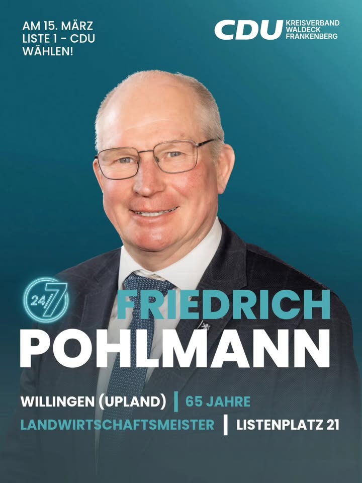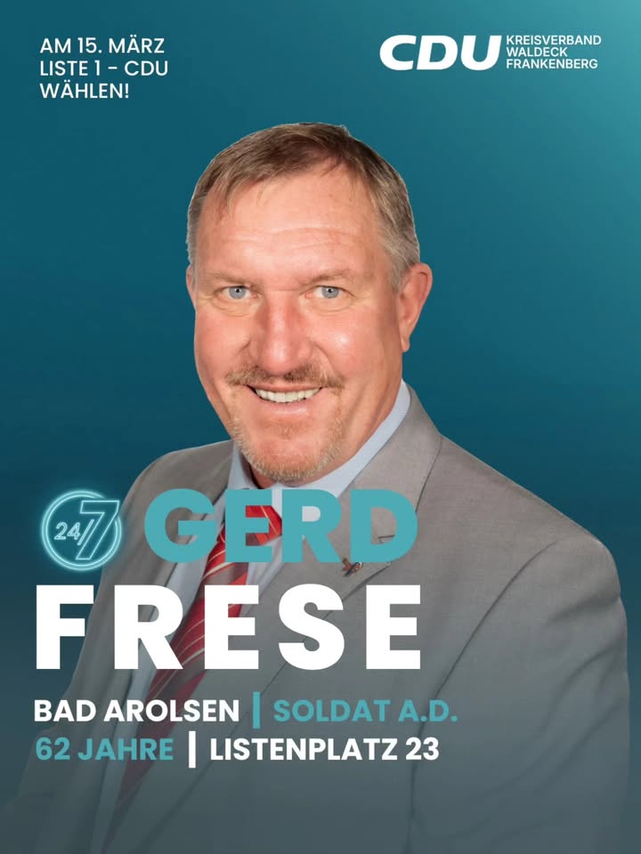 Ich bin Gerd Frese, 62 Jahre, aus Bad Arolsen und beruflich Soldat a. D.Ich kandidiere auf Listenplatz 23 für die CDU Waldeck-Frankenberg für den Kreistag.Ich freue mich auf einen engagierten Wahlkampf.Am 15. März: Liste 1 ? CDU wählen.
