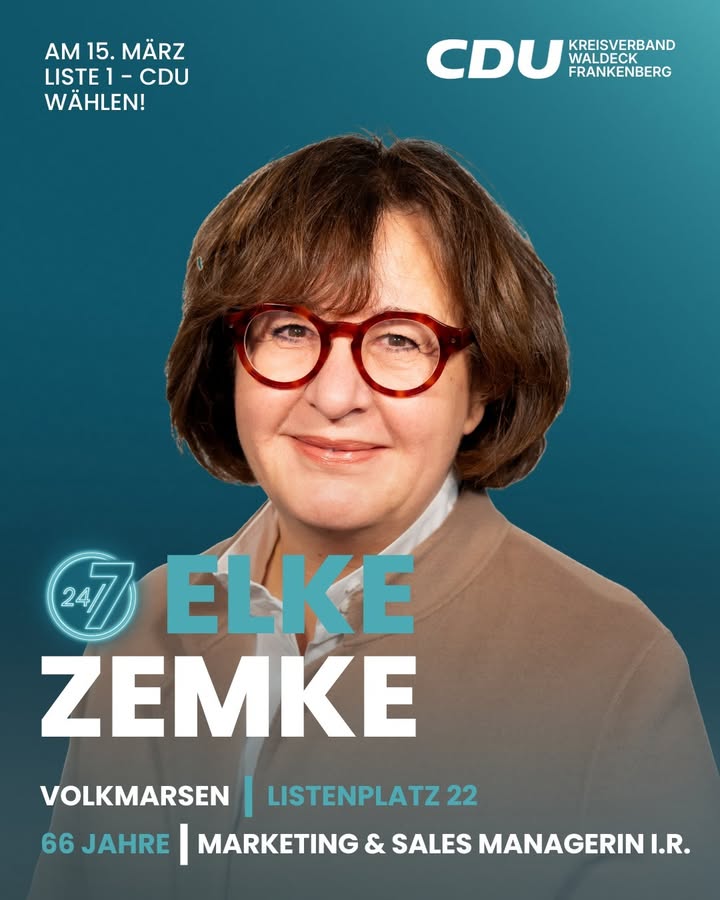 Ich bin Elke Zemke , 66 Jahre, aus Volkmarsen und beruflich Marketing- und Sales-Managerin i. R. Ich kandidiere auf Listenplatz 22 für die CDU Waldeck-Frankenberg für den Kreistag. Ich freue mich auf einen engagierten Wahlkampf. Am 15. März: Liste 1 ? CDU wählen.