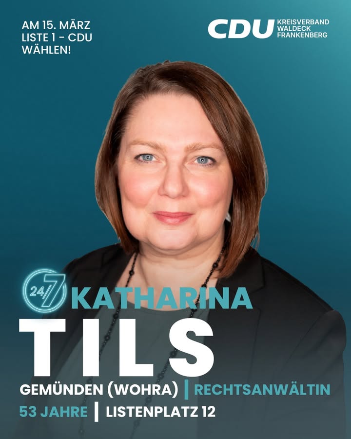 Ich bin Katharina Tils, 53 Jahre, aus Gemünden (Wohra) und beruflich Rechtsanwältin. Ich kandidiere auf Listenplatz 12 für die CDU Waldeck-Frankenberg für den Kreistag. Ich freue mich auf einen engagierten Wahlkampf. Am 15. März: Liste 1 ? CDU wählen.