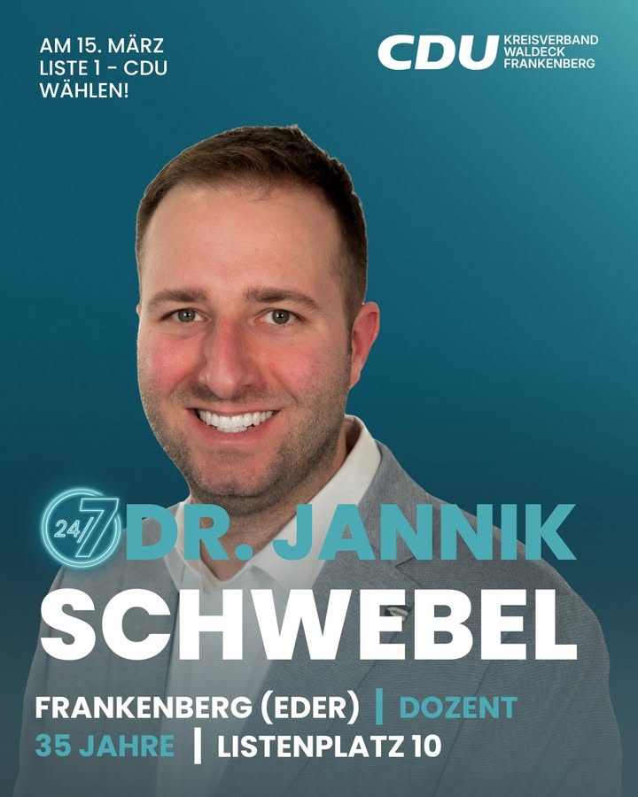Ich bin Dr. Jannik Schwebel, 35 Jahre, aus Frankenberg (Eder) und beruflich Dozent. Ich kandidiere auf Listenplatz 10 für die CDU Waldeck-Frankenberg für den Kreistag. Ich freue mich auf einen engagierten Wahlkampf. Am 15. März: Liste 1 ? CDU wählen.