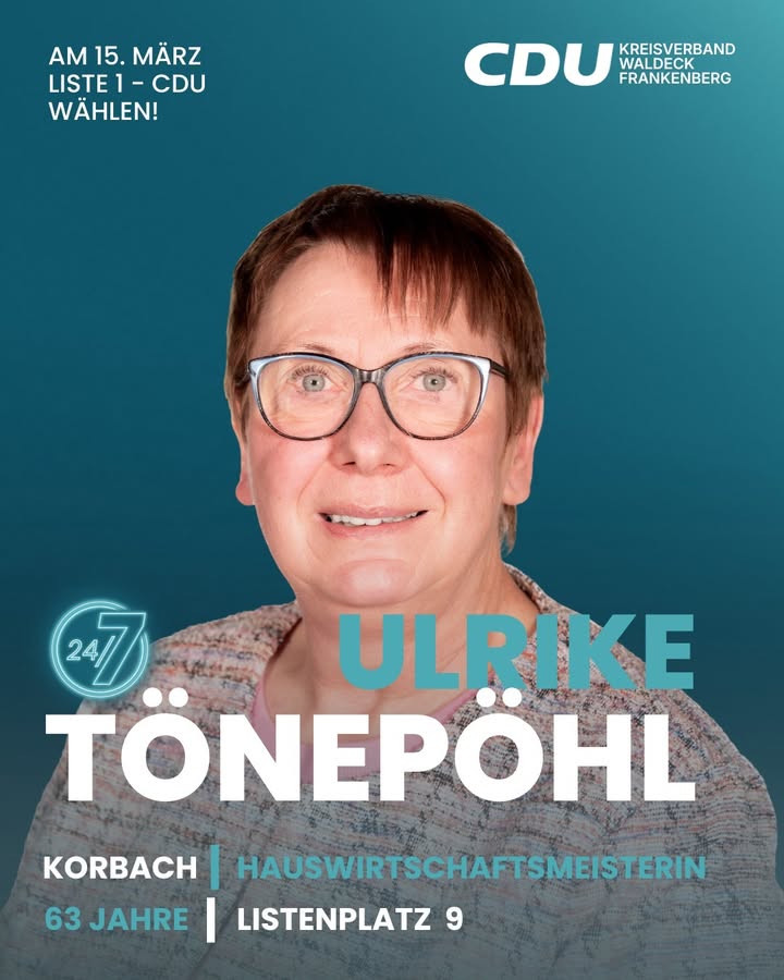 Ich bin Ulrike Tönepöhl, 63 Jahre, aus Korbach und beruflich Hauswirtschaftsmeisterin. Ich kandidiere auf Listenplatz 9 für die CDU Waldeck-Frankenberg für den Kreistag. Ich freue mich auf einen engagierten Wahlkampf. Am 15. März: Liste 1 ? CDU wählen.