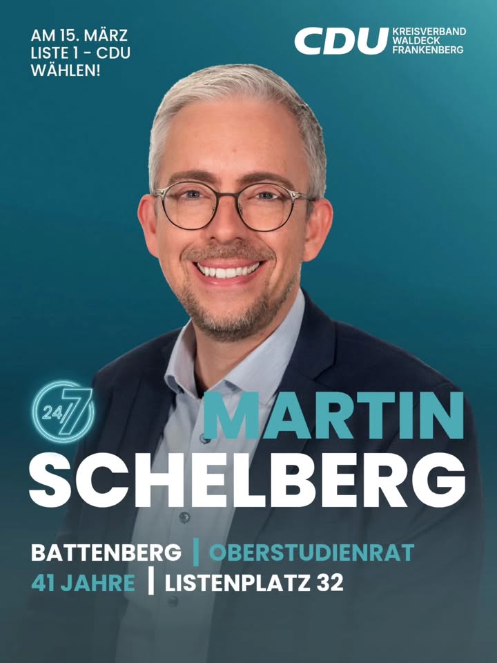 Ich bin Martin Schelberg, 41 Jahre, aus Battenberg (Eder) und beruflich Oberstudienrat. Ich kandidiere auf Listenplatz 32 für die CDU Waldeck-Frankenberg für den Kreistag. Ich freue mich auf einen engagierten Wahlkampf. Am 15. März: Liste 1 ? CDU wählen.