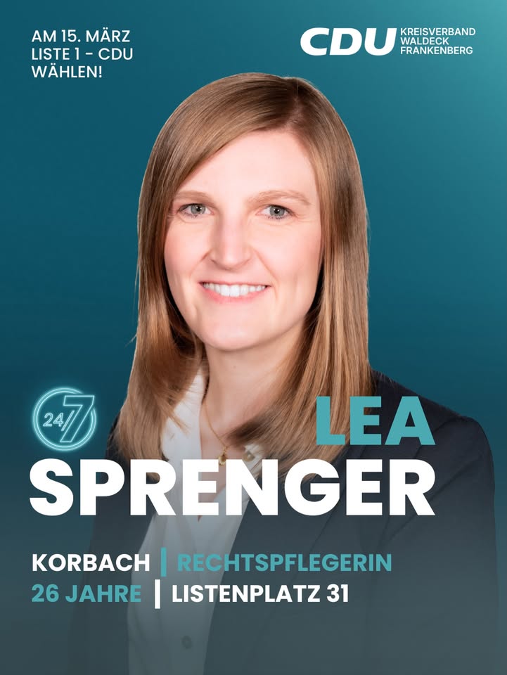 Ich bin Lea Sprenger, 26 Jahre, aus Korbach und beruflich Rechtspflegerin. Ich kandidiere auf Listenplatz 31 für die CDU Waldeck-Frankenberg für den Kreistag. Ich freue mich auf einen engagierten Wahlkampf. Am 15. März: Liste 1 ? CDU wählen.