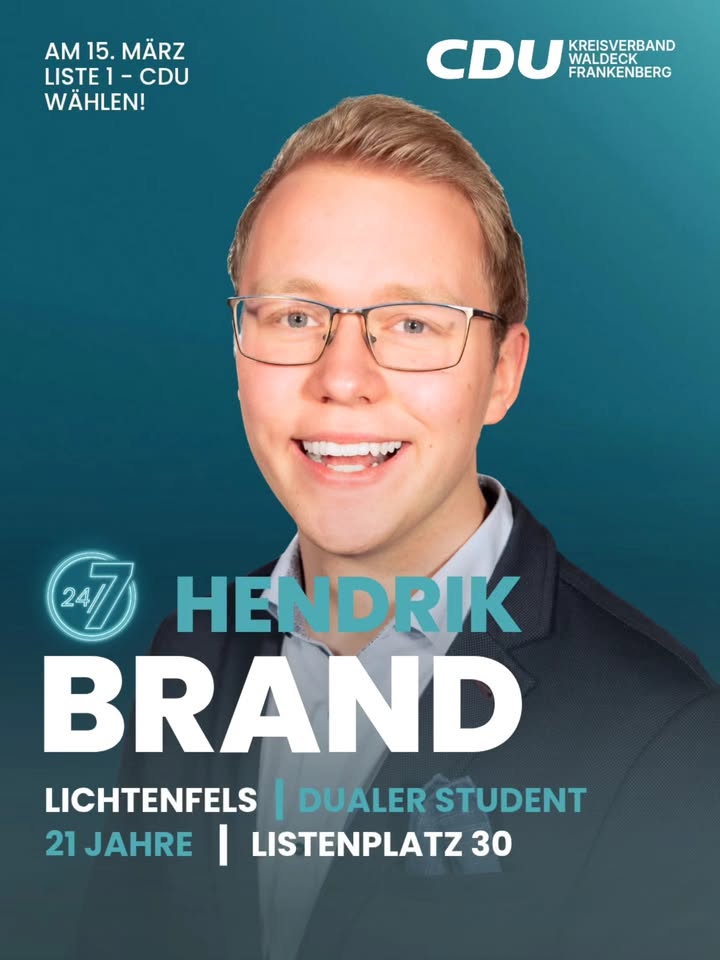Ich bin Hendrik Brand, 21 Jahre, aus Lichtenfels und beruflich dualer Student. Ich kandidiere auf Listenplatz 30 für die CDU Waldeck-Frankenberg für den Kreistag. Ich freue mich auf einen engagierten Wahlkampf. Am 15. März: Liste 1 ? CDU wählen.