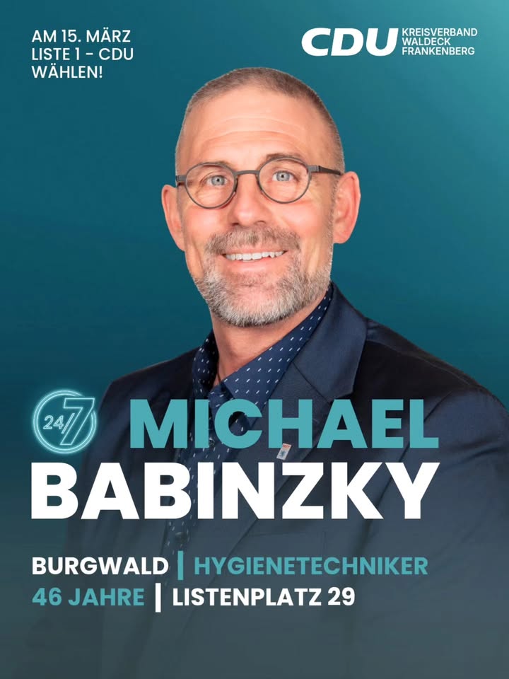 Ich bin Michael Babinzky, 46 Jahre, aus Burgwald und beruflich Hygienetechniker. Ich kandidiere auf Listenplatz 29 für die CDU Waldeck-Frankenberg für den Kreistag. Ich freue mich auf einen engagierten Wahlkampf. Am 15. März: Liste 1 ? CDU wählen.