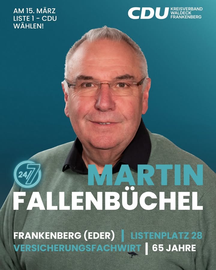 Ich bin Martin Fallenbüchel, 65 Jahre, aus Frankenberg (Eder) und beruflich Versicherungsfachwirt. Ich kandidiere auf Listenplatz 28 für die CDU Waldeck-Frankenberg für den Kreistag. Ich freue mich auf einen engagierten Wahlkampf. Am 15. März: Liste 1 ? CDU wählen.