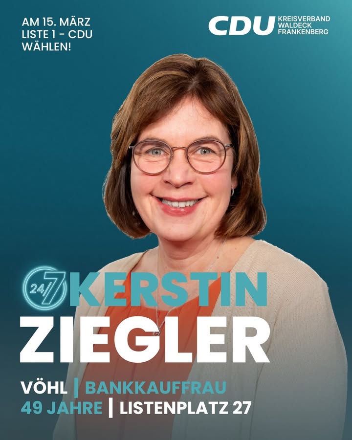 Ich bin Kerstin Ziegler, 49 Jahre, aus Vöhl und beruflich Bankkauffrau. Ich kandidiere auf Listenplatz 27 für die CDU Waldeck-Frankenberg für den Kreistag. Ich freue mich auf einen engagierten Wahlkampf. Am 15. März: Liste 1 ? CDU wählen.